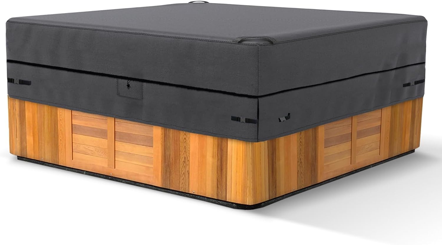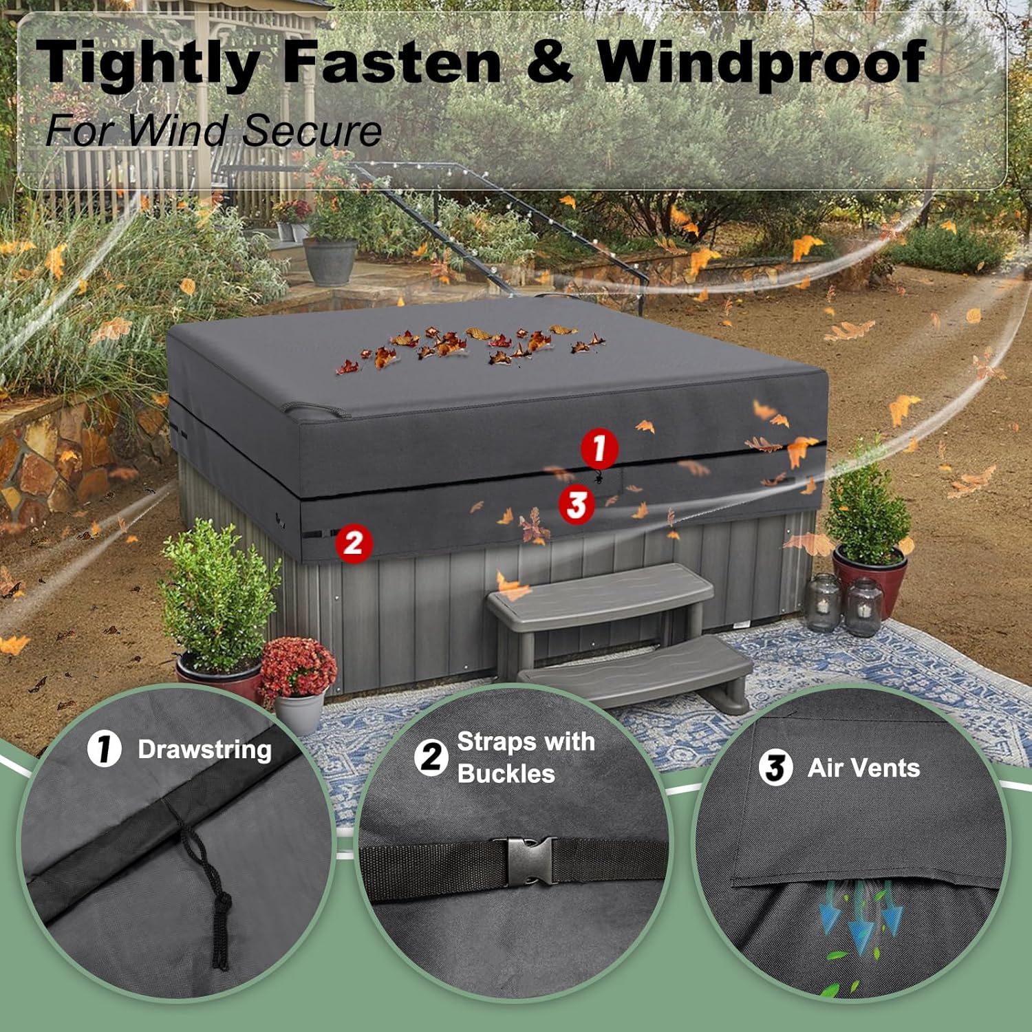 - 【Windproof & Breathable】Square hot tub cover large with 4 x click-in fasten straps, and adjustable drawstrings. So you can tighten the cover in place as needed, to keep the spa hot tub hard top cover from blowing off while storm. 2 x air vents keeps air flowing to prevent condensation and wind blown off the cover.