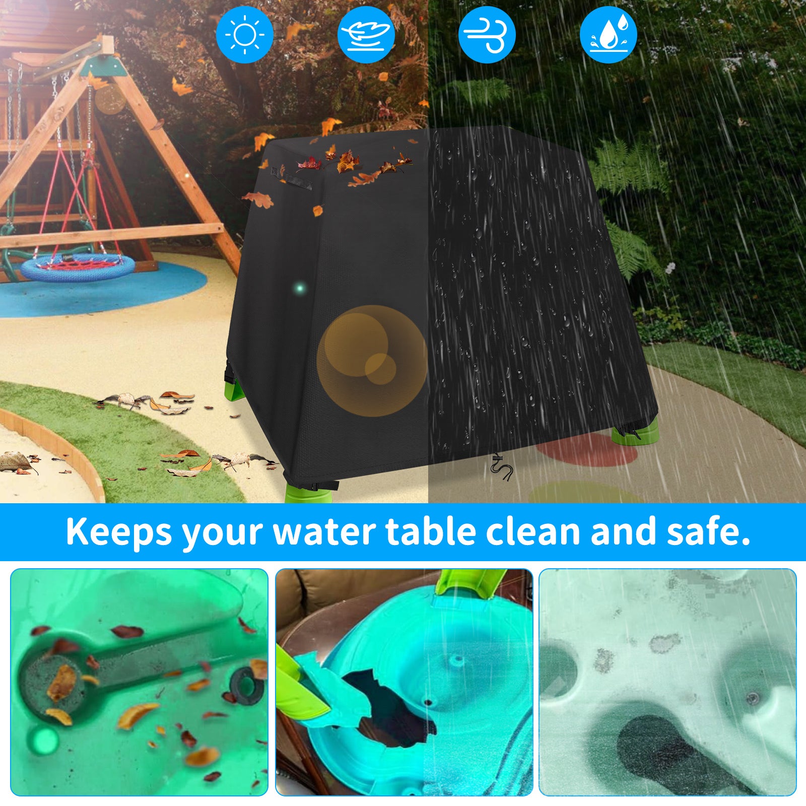 - 【Waterproof and Dustproof】-Outdoor water table toy cover is made of high density waterproof material with double needle sewing process, durable and waterproof. Protecting your water table from rain, dust, and fallen leaves. Keep your child's toys in a brand new state.